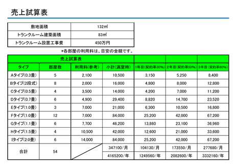(クリックするとPDFファイルをダウンロードできます)トランクルーム設置の工事費が450万に対して、1年目で約120万、2年目で200万、3年目で330万、の売上となり、およそ3年で工事費がペイできる試算となります。