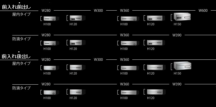 ここで選択するポイントは3つ。「前入れ前出し」か「前入れ後出し」かを選択投入口と同じ側から取り出すなら「前入れ前出し」投入口の反対側から取り出すなら「前入れ後出し」「屋内タイプ」か「防滴タイプ」かを選択雨風が当たらない場所なら「屋内タイプ」屋外の軒下など雨風が当たる場所なら「防滴タイプ」幅×1戸あたりの高さを選択設置可能スペースをよく確認して選択しましょう。
