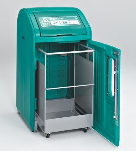 カワジュン製のこの回収ボックスはエコを意識した緑のボックスで
