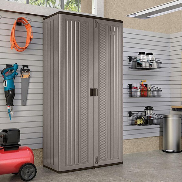 あらゆるスペースに似合う魅力的なデザインの屋内用キャビネット。丈夫な2重壁構造(ブロー成形)採用し、簡単に組み立てができます。棚板3枚付属。耐荷重は棚板一枚につき34kgまで対応。南京錠を利用して施錠も可能。