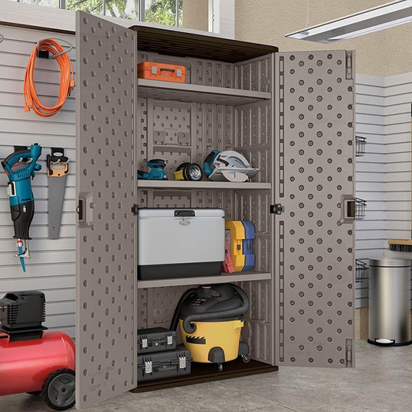 あらゆるスペースに似合う魅力的なデザインの屋内用キャビネット。丈夫な2重壁構造(ブロー成形)採用し、簡単に組み立てができます。棚板3枚付属。耐荷重は棚板一枚につき34kgまで対応。南京錠を利用して施錠も可能。
