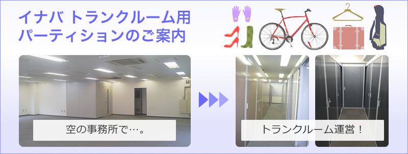 また、マンションの共有部に設置される住居者向けクローゼットもトランクルームと呼ばれています。当店ではトランクルーム経営に必要な間仕切りやパーティショといった商材を工事込みでで販売しております。
