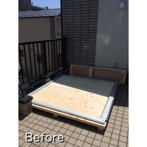 まず木製基礎を制作、それを屋上の壁に固定しその上にDM-7を組み、突風等で揺れない様に、上下部しっかり固定し上部窓部分は、サイディング材で塞ぎました。