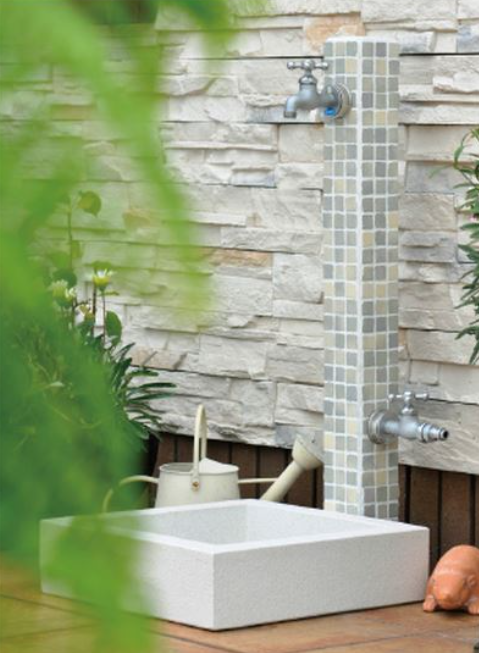 はそんなモザイクタイルを応用したお洒落な立水栓です。