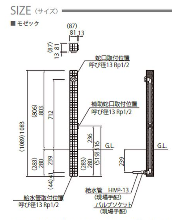 ■サイズ(mm)幅81×奥行87×高さ1089 ■重量(kg)6.3※当該商品は、蛇口・パンは別売です。モゼックパン ミント(MNT)■蛇口についてのご注意(蛇口は別売です。)蛇口を取り付ける際、付属のザルボと給水サガネをご使用ください。ご使用いただきませんとタイル面を破損する恐れがあります。■その他のご注意・補助蛇口を使用する場合は、施工後交換できるように水栓柱を壁から離して施工してください。・補助蛇口仕様の配管は、商品の向かって右側が取付位置になります。左側につくタイプはありませんので、ご了承ください。・取り付ける蛇口によ...
