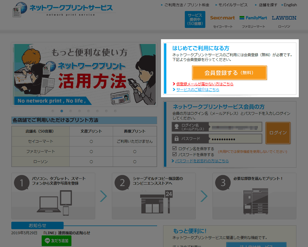 ネットワークプリントサービスはSHARPのコピー機を設置しているコンビニエンスストア(セイコーマート、ローソン、ファミリマート/サークルK・サンクス)で利用可能で、PCやスマホのファイルを、コンビニエンスストアのコピー機から出力できるサービスです。