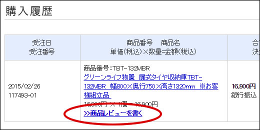 商品レビュー書き込みページに行くには、以下の2通りの方法がございます。