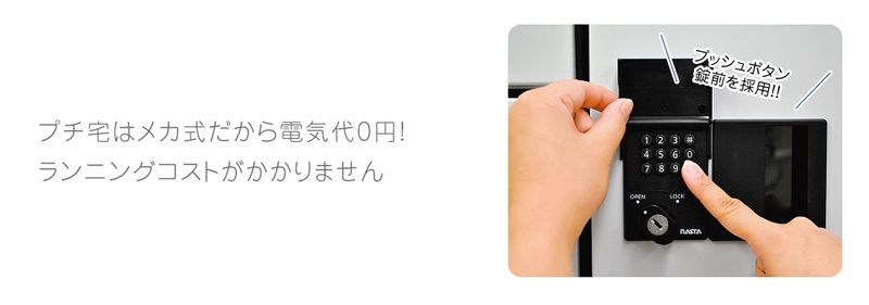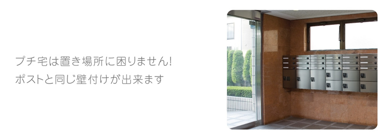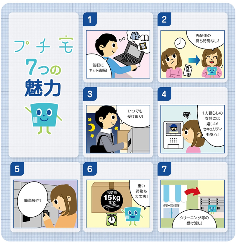 プチ宅7つの魅力 1.気軽にネット通販 2.再配達の待ち時間なし 3.いつでも受け取り 4.一人暮らしの女性にはうれしいセキュリティも安心 5.簡単操作 6.重い荷物も大丈夫 7.クリーニングなどの受け渡し