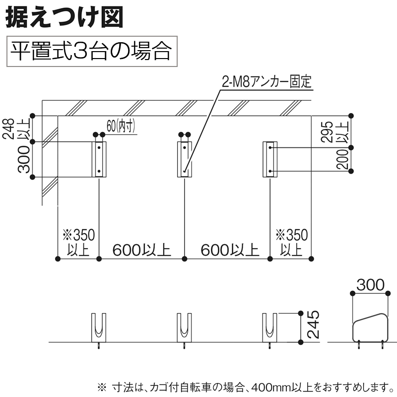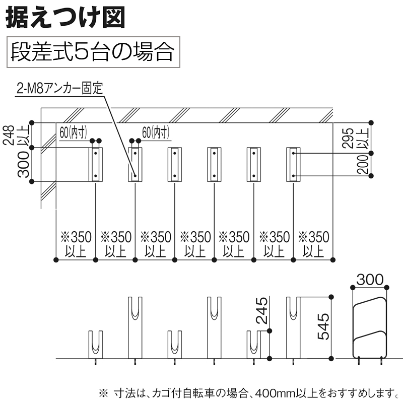 ●ラック取り付けピッチは、高低が交互となる組み合わせで350mm以上(カゴ付自転車の場合は、400mm)以上をおすすめします。