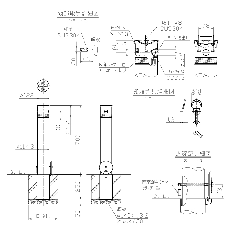 駐車ポール サンポール リフター Φ114.3 差込式カギ付 クサリ内蔵 LA-12SKC 車止め 駐車場 ポール ステンレスの通販は環境生活