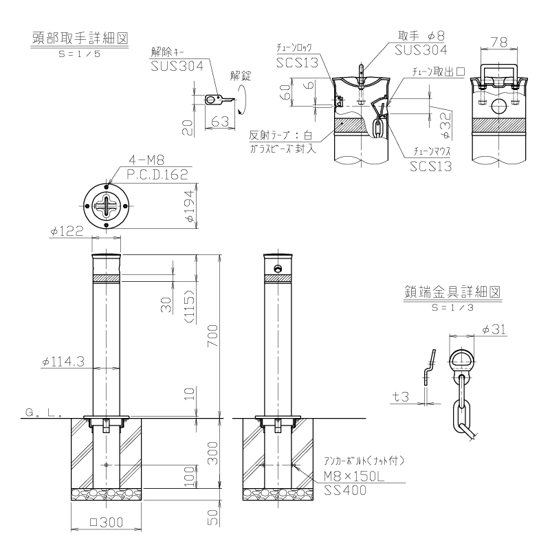 駐車ポール サンポール リフター Φ114.3 固定式 クサリ内蔵 LA-12UC 車止め 駐車場 ポール ステンレスの通販は環境生活