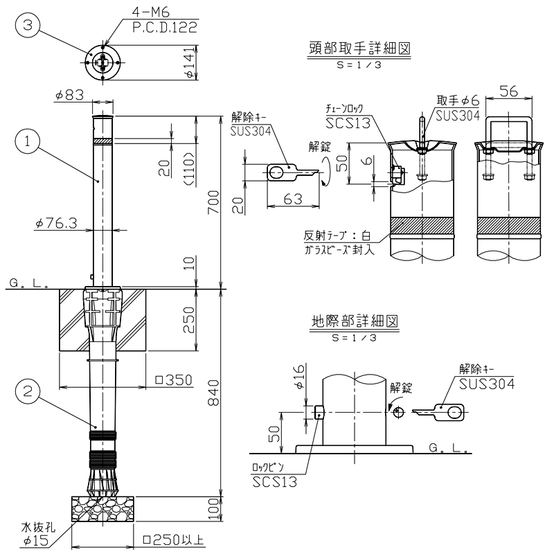 駐車ポール サンポール リフター φ76.3 上下式 標準タイプ ワンタッチロック付 エンド用 LA-8LC-E 車止め 駐車場 ポール ステンレスの通販は環境生活