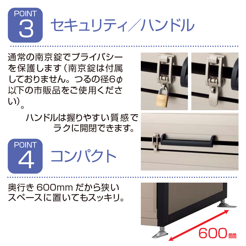 ●セキュリティ/ハンドル:通常の南京錠でプライバシーを保護します(南京錠は付属しておりません。つるの径6mm以下の市販品をご使用ください)。ハンドルは握りやすい質感でラクに開閉できます。
