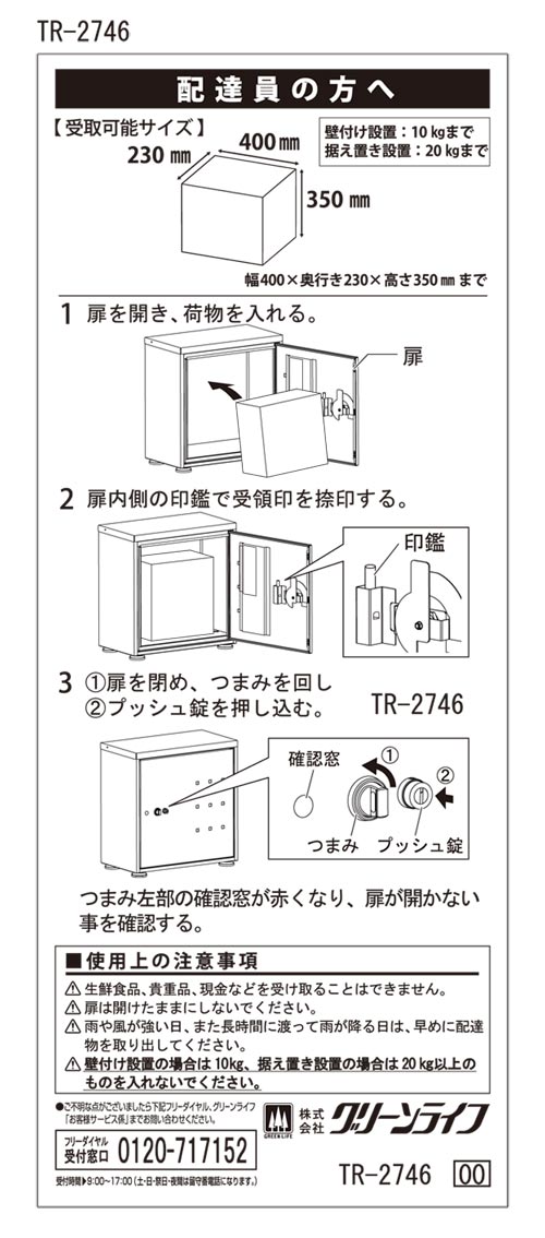 ●郵便も、メール便も、宅配物もこれ一台で受け取れる!●前扉裏に付属のケースにシャチハタを収納することで不在時でも再配達の手間無く宅配物が受け取れます●宅配物が入っているかどうか一目でわかる確認窓付き●配達員にもわかりやすい荷物の入れ方を上蓋裏側にて説明