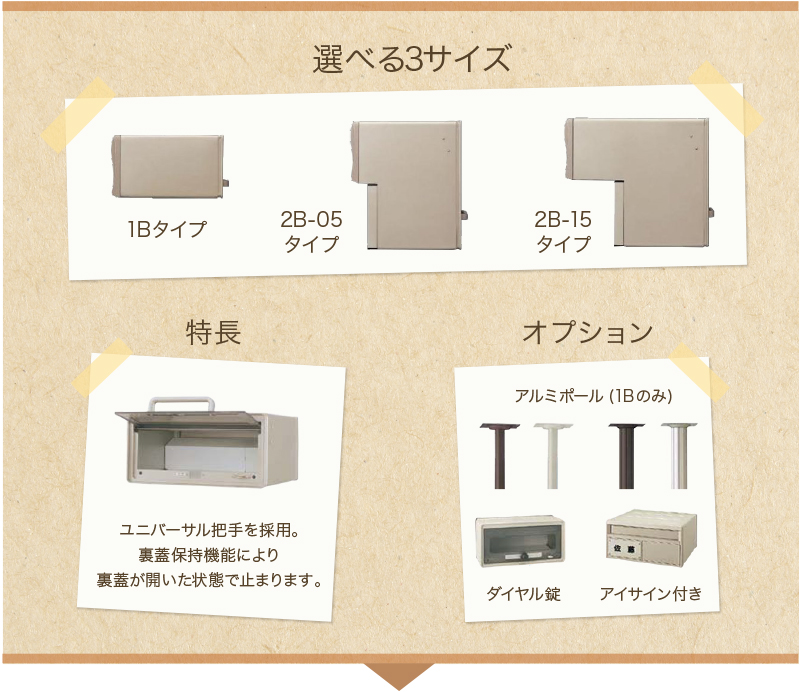 タイルや壁に埋め込むタイプと、ポール建ても可能なポストです。