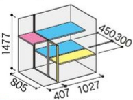 ※青色の棚は標準装備の棚板です。赤色・黄色等の棚板は別売りオプション品です。