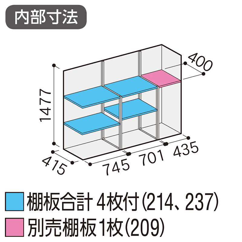 ※青色の棚は標準装備の棚板です。赤色・黄色等の棚板は別売りオプション品です。