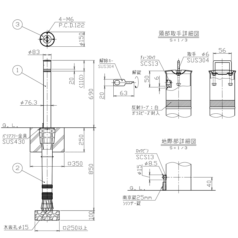 上下式(専用固定式あり) サンポール リフター φ76.3 上下式 バリアフリータイプ カギ付 エンド用 LA-8KC-E-BF 車止め 駐車場 ポール ステンレスの通販は環境生活