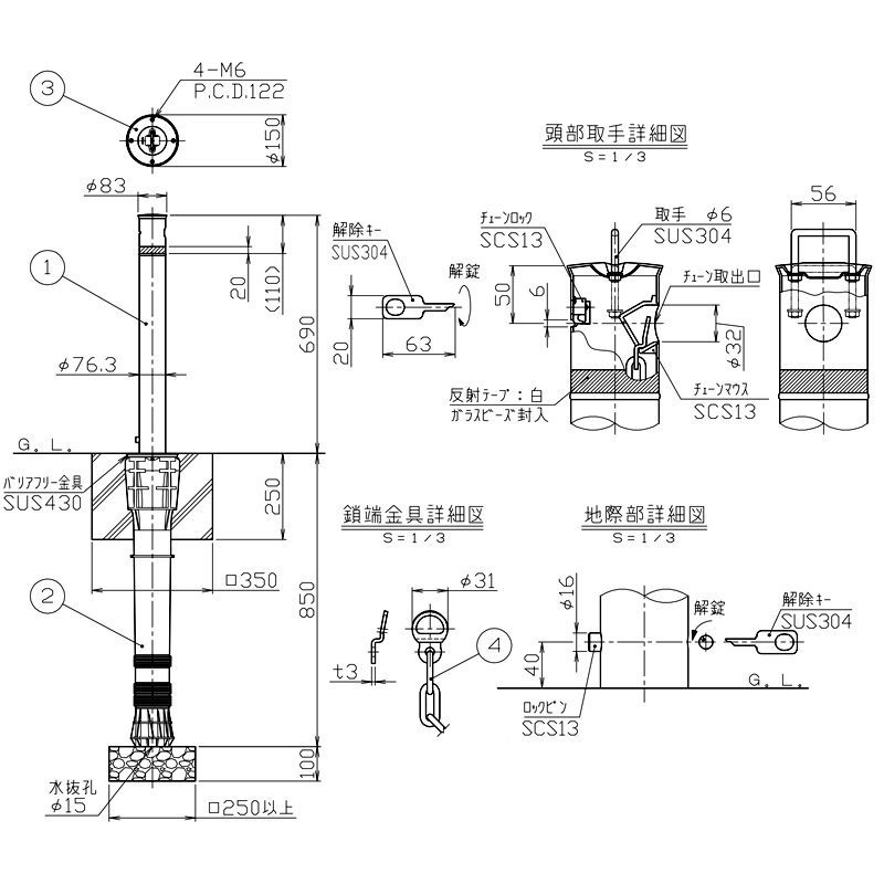 上下式(専用固定式あり) サンポール リフター φ76.3 上下式 バリアフリータイプ ワンタッチロック付 クサリ内蔵 LA-8LC-BF 車止め 駐車場 ポール ステンレスの通販は環境生活