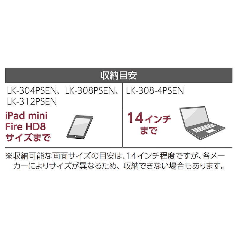 ●収納可能な画面サイズの目安は、14インチ程度ですが、各メーカーによりサイズが異なるため、収納できない場合もあります。