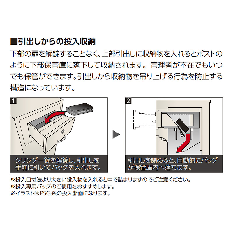 下部の扉を解錠することなく、上部引出しに収納物を入れるとポストのように下部保管庫に落下して収納されます。