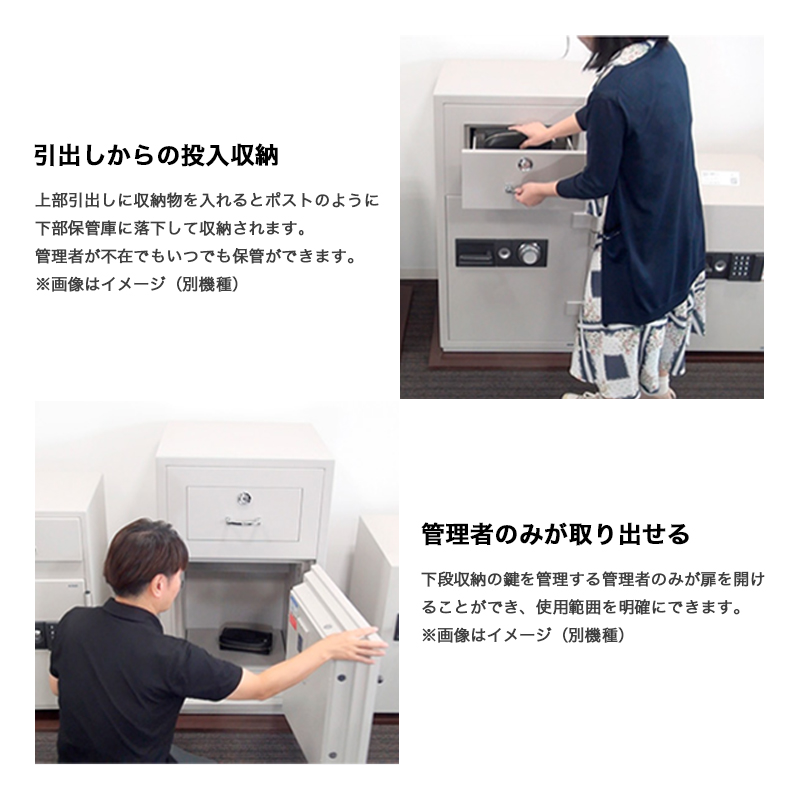 下部の扉を解錠することなく、上部引出しに収納物を入れるとポストのように下部保管庫に落下して収納されます。