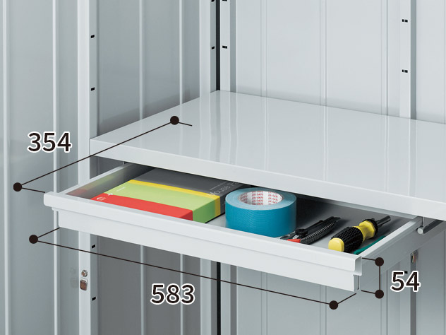 棚板の下に引き出しを取り付けることにより、工具などの小物を収納できます。