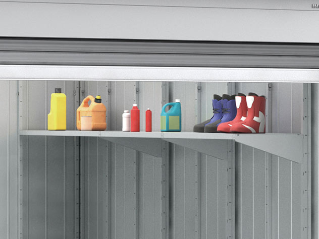 設置もできるよう十分な高さを確保しました。物置メーカーの保管庫だから収納力の高い棚も自慢です。