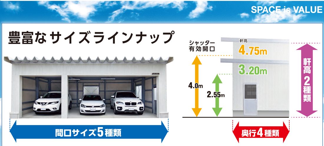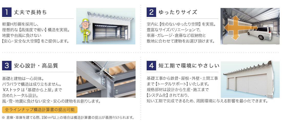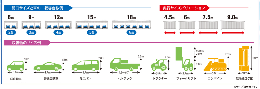 車両や農機具を収納するガレージから資材倉庫まで、 ニーズに合わせた豊富なラインナップ。 鉄構造(前面ラーメン構造)が生み出すゆったりした間口で開放的な空間を実現。 基礎の設計・施工から建物の施工・アフターフォローまで、トータルサポートなので安心です。 全ラインナップ「構造計算書」の提出が可能な安心設計。多雪地にも対応できます。