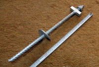 ベースパイプを設計サイズに設置し、ベースパイプのアンカー穴に大ハンマーなどで打ち込みます。仮設用ペグは強風に耐える事ができません。
