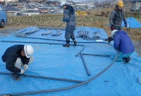 テントシートを掛け、パイプに固定します。ハイルーフの場合は別途あおり止めロープで固定します。