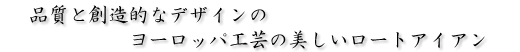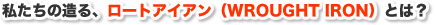 ロートアイアン(Wrought Iron)は、鉄をハンドワークによって造形していく加工技術です。一般的に、材料を加熱させてハンマーで打ち、これを何度も繰り返し、目的の形を造形して製作したものをロートアイアンと呼んでいます。(ロートアイアンの「Wrought」とは”加工した・鍛えた・細工した”という意味。) ロートアイアンは古くは主に武具として刀剣、鎧、蹄鉄などにこの技法が用いられていました。ヨーロッパ中世時代に教会、城郭、都市建造物などに装飾性を兼ね備えた実用品として使われ始めて以来、歴史の流れの中で脈々と受け継がれ、その後アールデコ、アールヌーボの時代を経て、芸術、建築などの各分野にも発展し現在に至ります。 日本では、6世紀前半(遣隋使・遣唐使の頃)に鍛鉄の技法が伝わり、農耕具、日本刀などが鍛鉄で作られましたが建築装飾への応用はほとんどありませんでした。