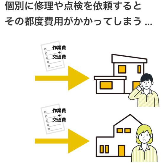 管理組合や自治会など複数戸まとめて依頼していただくことで交換や点検費用をより抑えることができます。当店は給湯器だけでなく「小修繕サービス」も承りますので住居内の傷修復や網戸の交換など小さなお困りごともまとめて対応可能です。