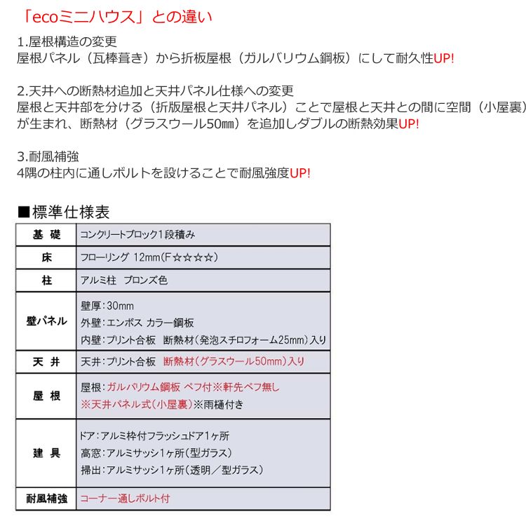 耐久性・断熱効果・耐風強度エコミニハウスよりもさらに高くなっています。