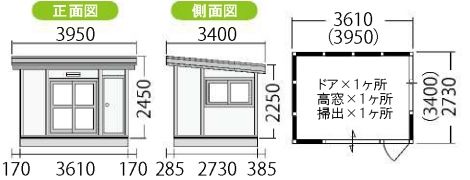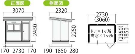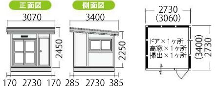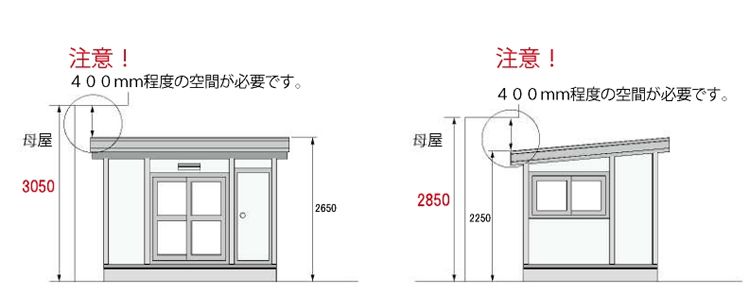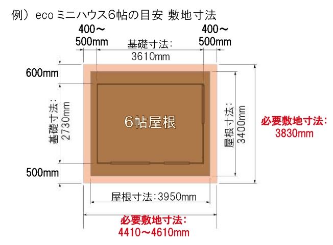 eco ミニハウス6帖の場合、本体の一番高いところで2450mm、低いところで2250mmの高さになります。そこに基礎の高さ(ブロック基礎約200mm)をプラスし、施工スペースも考慮するとそれぞれ3050mm、2850mm程度の高さ寸法が必要になります。