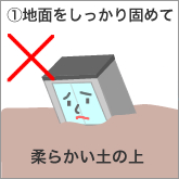 ①設置場所の下地が土の場合は、地面に飛び乗って地盤を固めて下さい。きちんと整地しないと物置に物を入れた際に地面が沈んだりします。 -