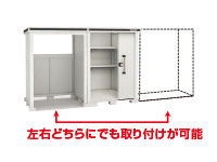 オープンスペースは物置の左右どちらにでも取り付けが可能。幅広いライフスタイルに合わせた収納プランのお手伝いをいたします。