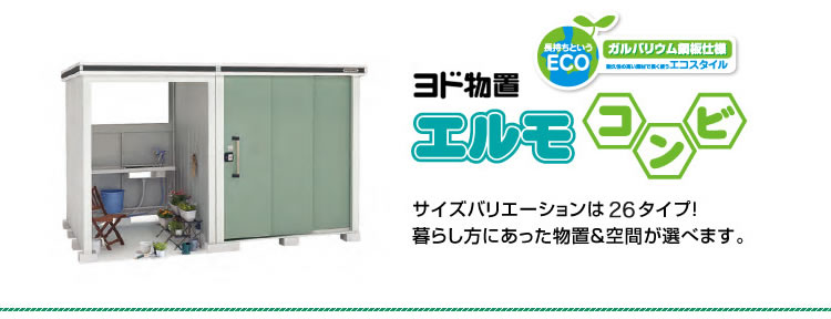 ヨド物置エルモコンビを激安販売!エルモコンビは、通常の物置にプラスアルファオープンスペースが付いた物置です。自由に使えるスペースを活用してお客様なりのライフスタイルを演出しましょう!